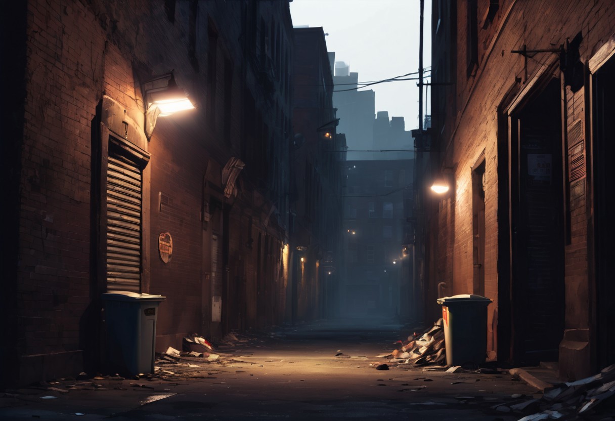 A dimly lit 2D alley at night, with tall, shadowy buildings on either side. The only light comes from a flickering streetlamp casting long, dark shadows on the cracked pavement. Trash cans and debris line the alley, adding to the eerie atmosphere