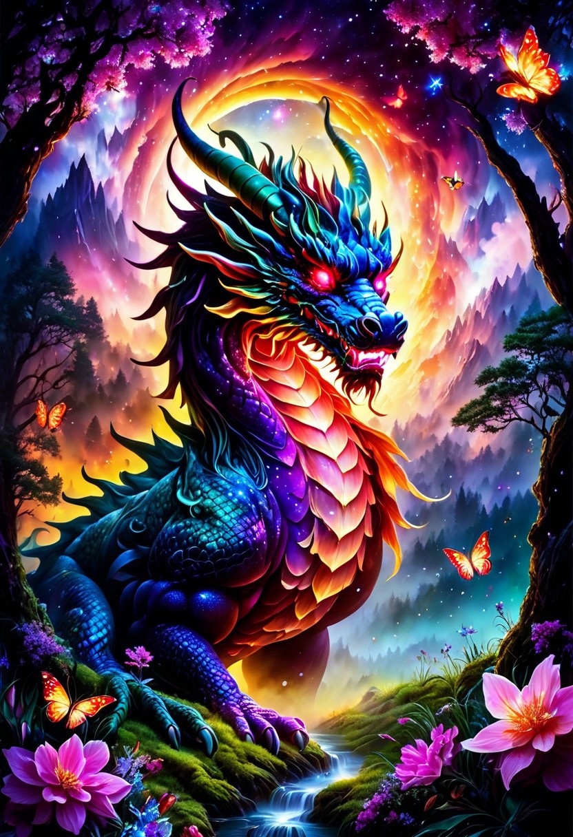 realism,mystical forest nebula an ancient Chinese dragon sneaks through the nebula,circling around 1 beautiful forest fairy,picturesque colors flowing in sync colorful meadow with many different flowers,early dew,small drops of dew on the flowers and grass,first rays of the rising sun,colorful butterflies