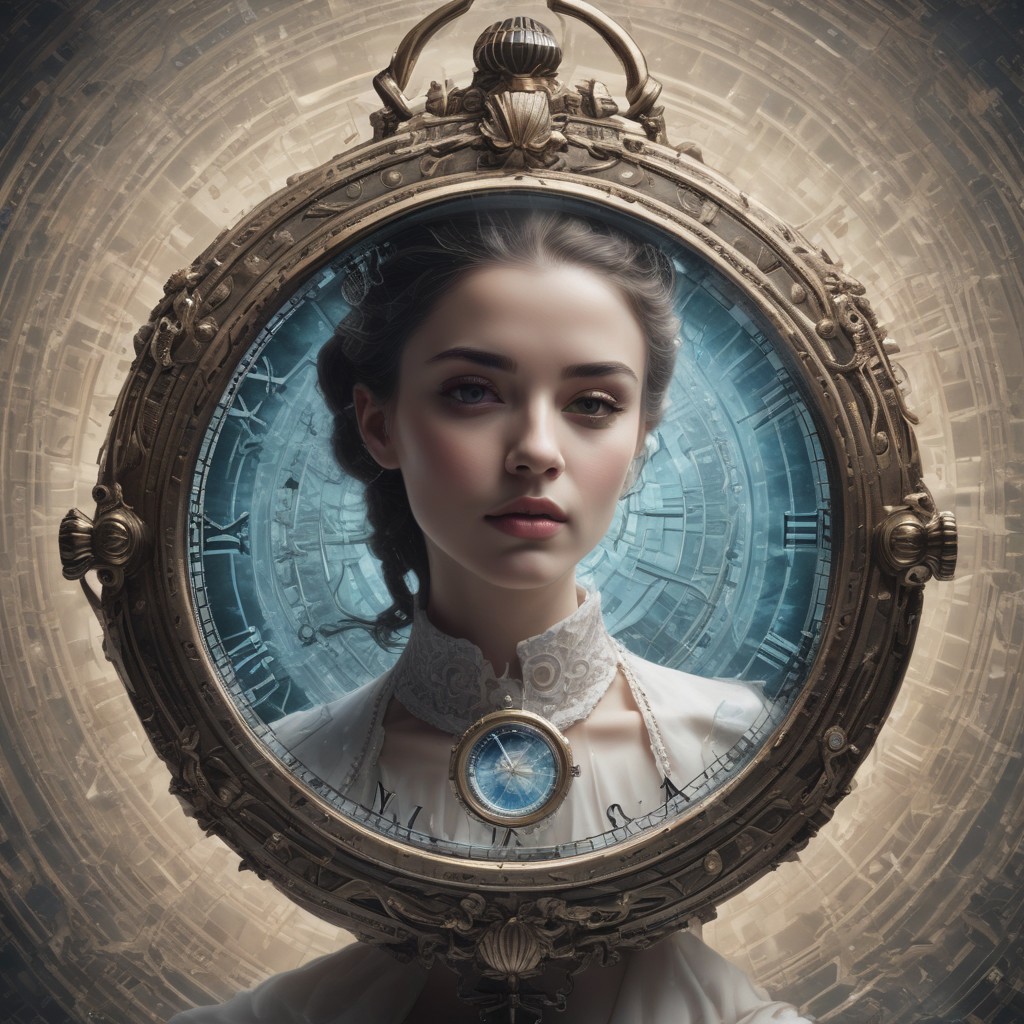 Futuristic communicator disguised as an antique pocket watch, projecting a hologram of a beautiful woman above its dial, science fiction, technology,