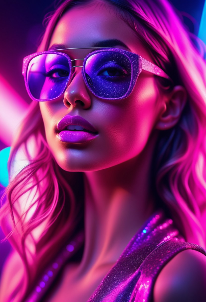 Neon-lit close-up, A hyper-realistic close-up of a beauty supermodel sexy girl face, big lips, bathed in neon pink and purple light with glittering particles on her skin, neon sunglasses with glitter textures patterns, fashion magazine style, beautiful background, Use soft colors and a shallow depth of field