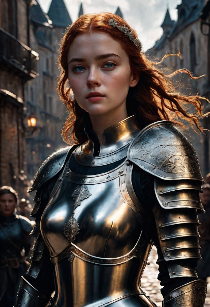 High resolution ultra-realistic of Beautiful Warrior Sadie Sink as Joan of Arc, 8k, capturing the intensity of the moment, cinematic lighting, standing on a bloody and stormy battlefield in bloody battle, wavy red hair, realistic dirty pale face, realistic blue eyes, beautiful hourglass figure, burning in a medieval Town, intricately designed iron and silver armor, Dark Ages Aesthetic, perfect athletic figure, beautiful Warrior Joan of Arc, fire, ultra realistic, cinematic style, vigorous and seductive, athletic figure, dark fantasy, dramatic lighting, wet and sweaty skin, dirty skin, athletic figure, dark fantasy, dramatic lighting, Greg Rutkowski style,, Warrior Joan of Arc on in iron armor, hyper-detailed, hyper-realistic, bright colours, Attractive 21 old years girl, Attractive, beautiful firm Breasts, sharp focus, digital painting, Photograph Taken on Nikon D750, Alphonse Mucha, 8K, athletic figure, Hyperdetailed, hyperrealism, Attractive, Attractive bust girl, asymmetric balance
