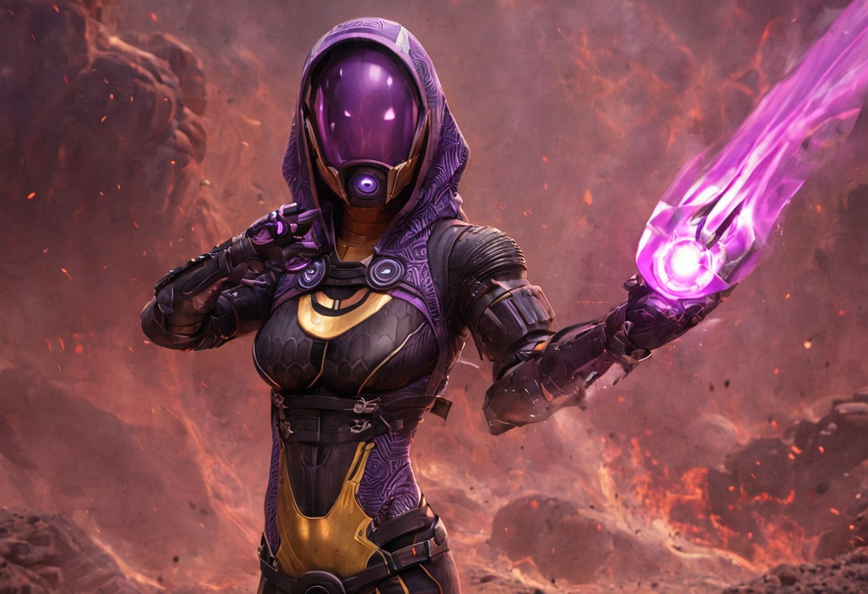 1girl, zavy-tali, alien, hooded, helmet, visor,exosuit, multicolored exosuit, black bodysuit, purple bodysuit, honeycomb print, leg armor, mask-on, hkstyle, curvy, wide hips, three fingers, two toes, axe kick, kicking, standing on one leg, leg up, high kick, standing split