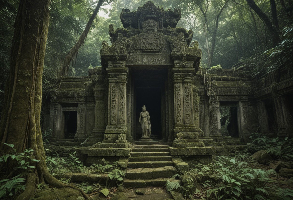 An ancient, overgrown temple hidden deep within a dense jungle. Vines and moss cover the stone walls, and statues of forgotten deities stand guard at the entrance. The air is thick with humidity, and shafts of sunlight filter through the thick canopy above. The sound of exotic birds and insects fills the air, while a hidden waterfall cascades nearby