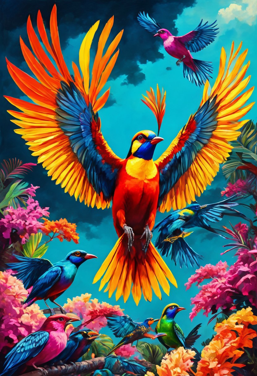 Create a painting picture seeing a group of paradise birds flying through the sky, vibrant muticolors, highly detailed, aesthetic, great lighting, perfect composition, a rich and complex image of nature, best quality, aptivating, intricately detailed, hyper detailed, maximalist style, photorealist, sharp focus, dynamic lighting, superb composition, finest details, highest aesthetics, best quality, sharp focus, high contrast, stylized, clear, colorful, ultra quality, 8k, best quality, masterpiece,midjourneyv6.1, double exposure