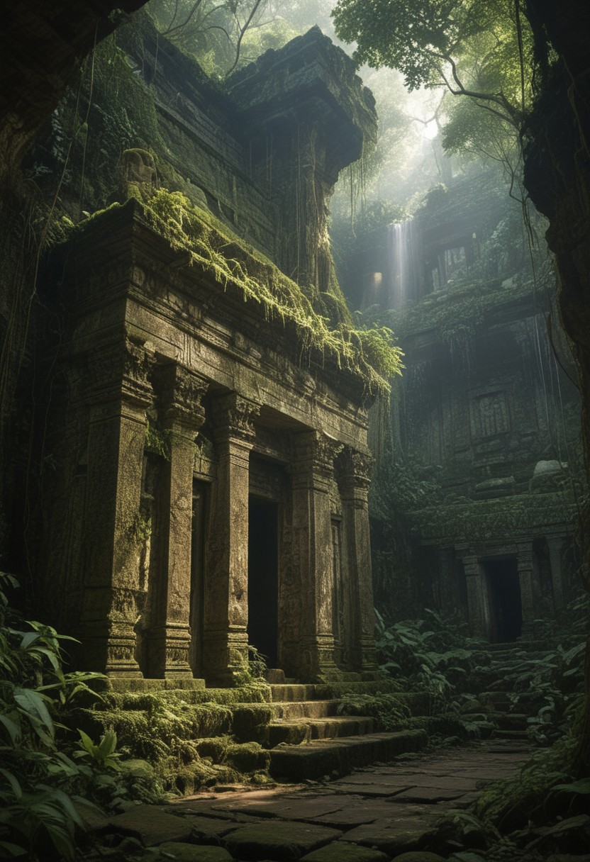 An ancient, overgrown temple hidden deep within a dense jungle. Vines and moss cover the stone walls, and statues of forgotten deities stand guard at the entrance. The air is thick with humidity, and shafts of sunlight filter through the thick canopy above. The sound of exotic birds and insects fills the air, while a hidden waterfall cascades nearby