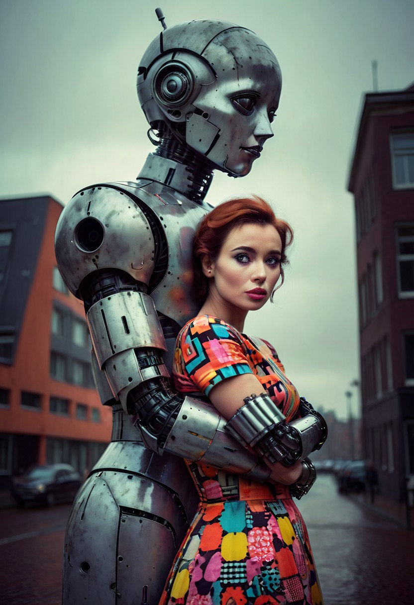 CyberRealistic_Negative, Create a surreal photo of a gorgeous fifties retro woman in a colorful bold pattern dress hugging a big robot, it’s a gloomy day, day in amsterdam, dark pastel colors, 35mm vintage kodak photography, easynegative, detailxl, CyberRealistic_Negative, perfecteyes, perfect eyes, skin blemish, detailed skin, FRESHIDEAS Illustration 62#, dark, chiaroscuro, low-key
