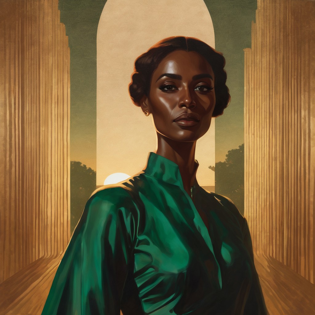 A phasomelic portrait of a woman in rich walnut and emerald, captured in a golden evening light, with the flowing silhouette of the setting sun reflected in her eyes.
