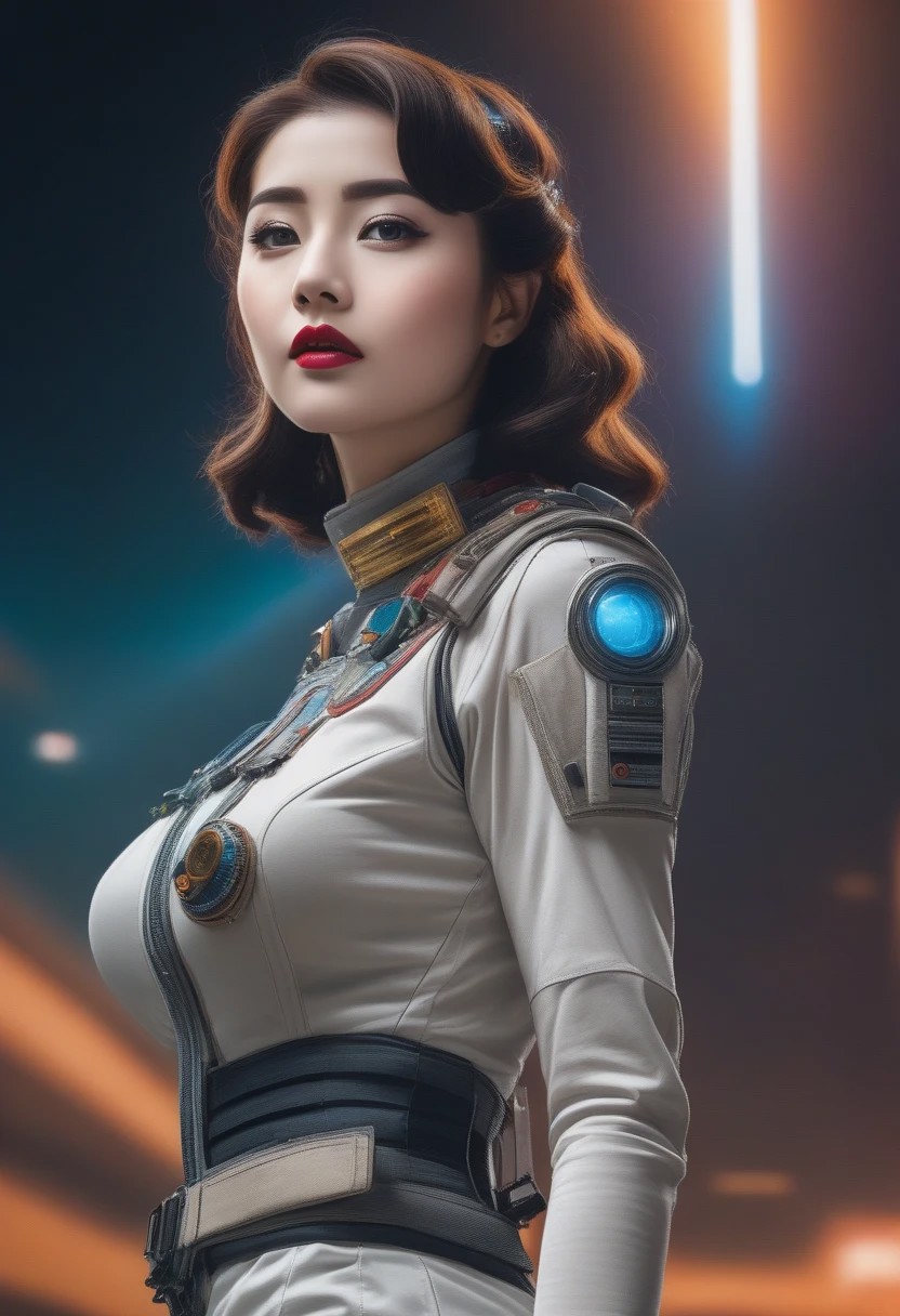 Kumi Mizuno pinup girl shoulder length hair wearing tight retro Sci-Fi tight Formal Dress Uniform, spacesuit, utility belt, high heel boots, multicolored, vintage pinup poses, standing at attention, long legged, narrow waist, narrow hips, retouched, Professional photography, bokeh, natural lighting, canon lens, shot on dslr 64 megapixels sharp focus retro-scifi, Water color, full length portrait, classical, powerful, colorful pencil and ink, fine line colored scribbles, full length portrait