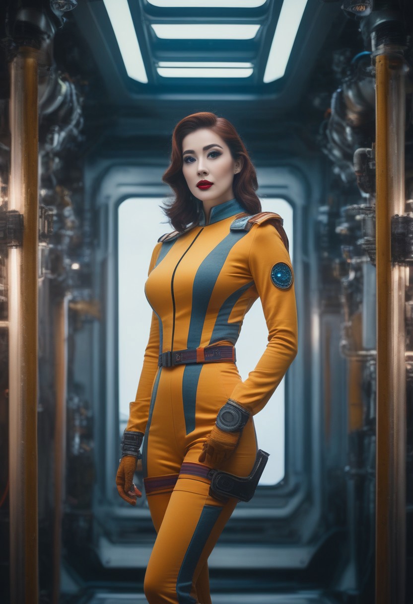 Kumi Mizuno pinup girl shoulder length hair wearing tight retro Sci-Fi tight Formal Dress Uniform, spacesuit, utility belt, high heel boots, multicolored, vintage pinup poses, standing at attention, long legged, narrow waist, narrow hips, retouched, Professional photography, bokeh, natural lighting, canon lens, shot on dslr 64 megapixels sharp focus retro-scifi, Water color, full length portrait, classical, powerful, colorful pencil and ink, fine line colored scribbles, full length portrait
