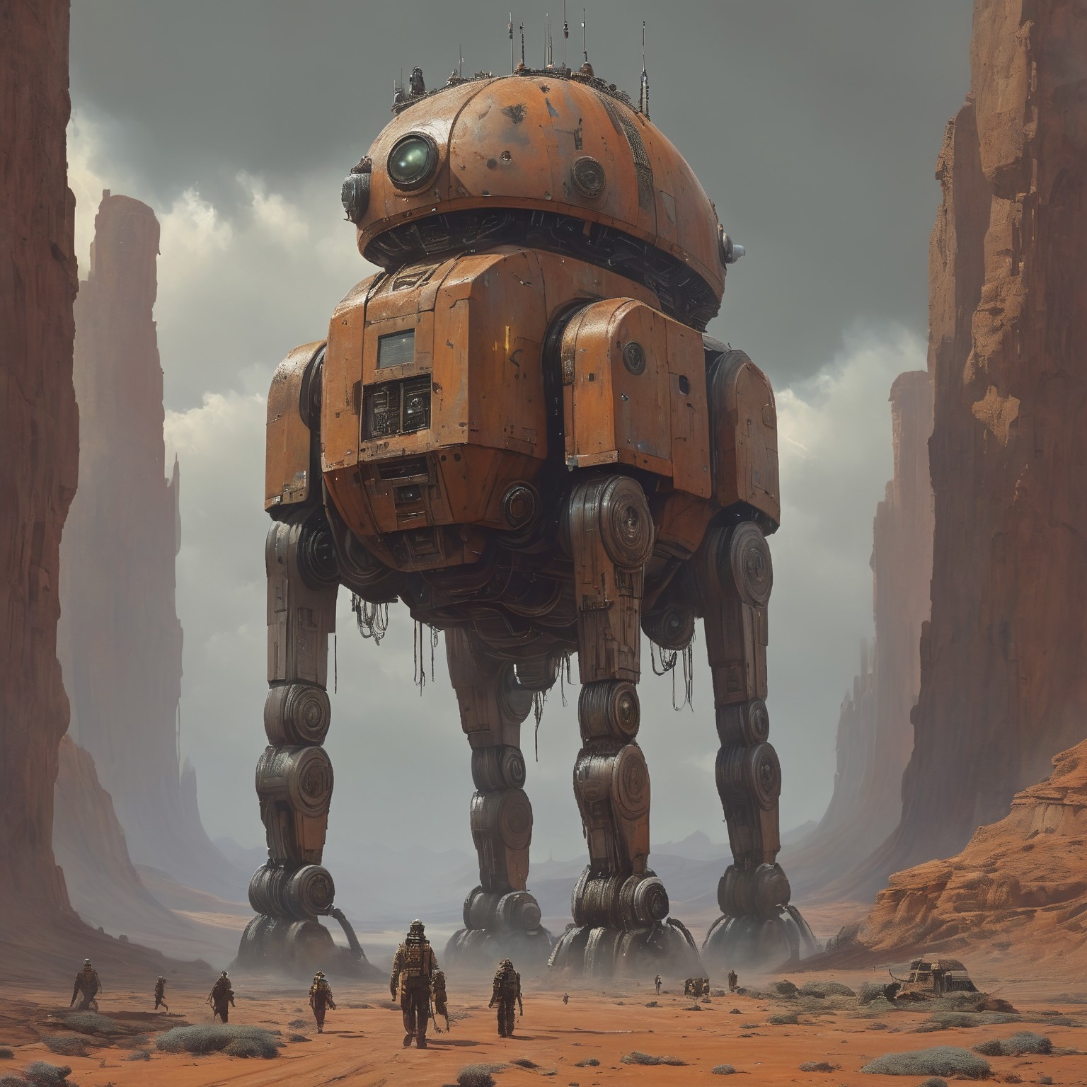 best quality, masterpiece,masterwork, painting, concept art, High angle From avove, camera from above, Bird's-eye view, aerial shot view, In the heart of the absurdes, (((army of giant mechanical golems marching across a desert planet))),(((armada))) ,lost technology, ancient,rust,dirt,worn metal,massive long legs,glow,moody, moss,dark clouds,dust,dramatic sky,science fiction, futuristic,high-tech,disturbing, terrifying,dramatic, illustration,scifi, ,dystopian,atompunk,dieselpunk, post-apocalypse epic,dark atmosphere,moody, detailed, dramatic lighting,arik roper,george lucas <lora:John Harris Style:0.8> John Harris Style page