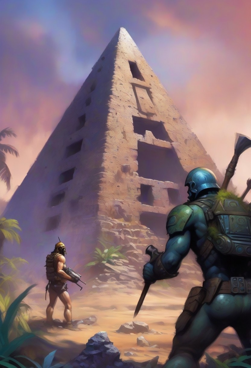 <lora:fr4z3tt4:0.75>fr4z3tt4, detailxl, young male in in military camouflage clothing weld a hammer Borderlands yeti creature ancient pyramid ruins arena in jungle view from behind inspired by Borderlands,