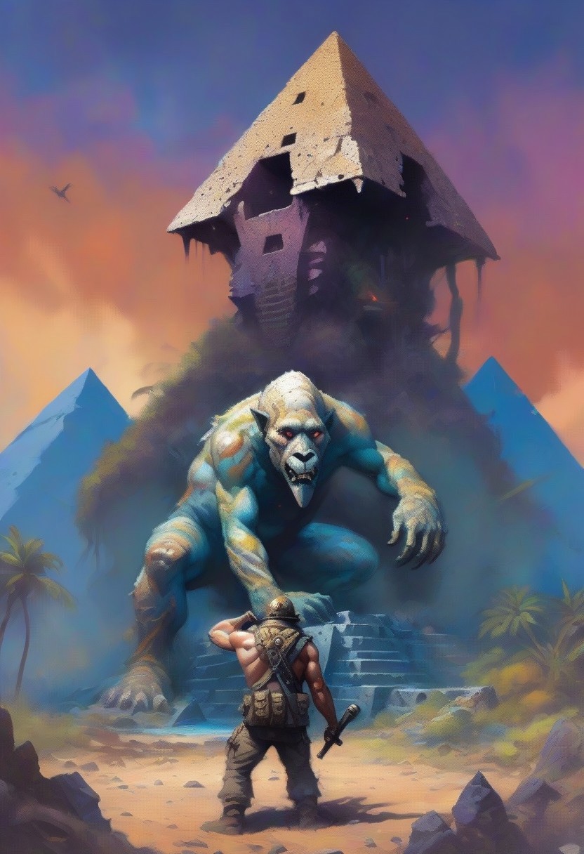 <lora:fr4z3tt4:0.75>fr4z3tt4, detailxl, young male in in military camouflage clothing weld a hammer Borderlands yeti creature ancient pyramid ruins arena in jungle view from behind inspired by Borderlands,