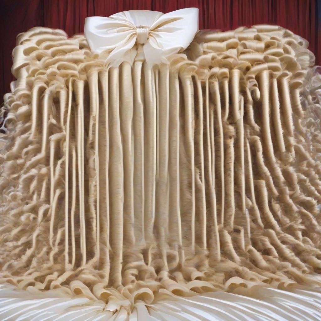 a blonde haired woman wearing his hair in a high ponytail tied with a very huge white colored hair bow and the ponytail styled in long tightly coiled, neat and slick drill curls and ringlets which fall past her shoulders and down her back, big blue eyes, red ruby lips, and a white colored victorian style wedding dress with lace and ruffles. She is standing in a gazebo in a flower garden.