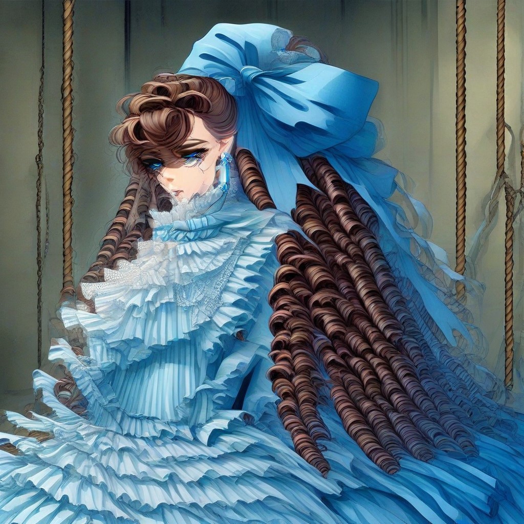 cartoon, a brown haired teenage boy wearing his hair in a high ponytail tied with a very huge blue colored hair bow and the ponytail styled in long tightly coiled, neat and slick drill curls which fall past his shoulders and are numerous and many and very long godiva length drill curls, big blue eyes, red ruby lips, and a blue colored victorian dress with lace and ruffles and blue high healed boots in a victorian style. he is wrap up with ropes and a cloth over his lower face