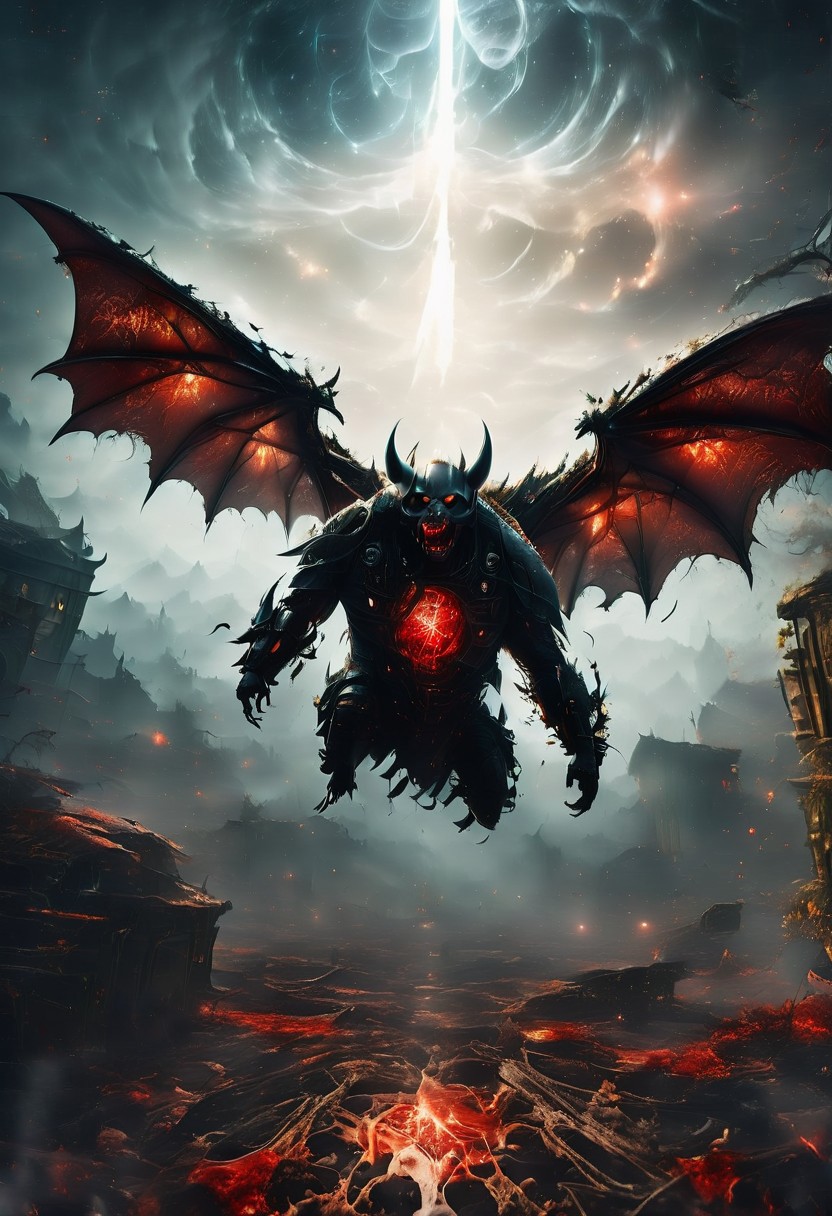 Score_9, Score_8_up, Score_7_up, Score_6_up, Score_5_up, realistic lighting and shadows, incredibly beautiful detailed background: 1.1, detailed and accurate forms, NOT HUMAN , wide angle lens, fully in frame Evil demon bat ghost with sleek and wispy body, bloody fangs, translucent red wings with silver bloody claws, floating through a Victorian gothic cemetery, full moon and mist, clutching a skeletal ethereal soul in his claws