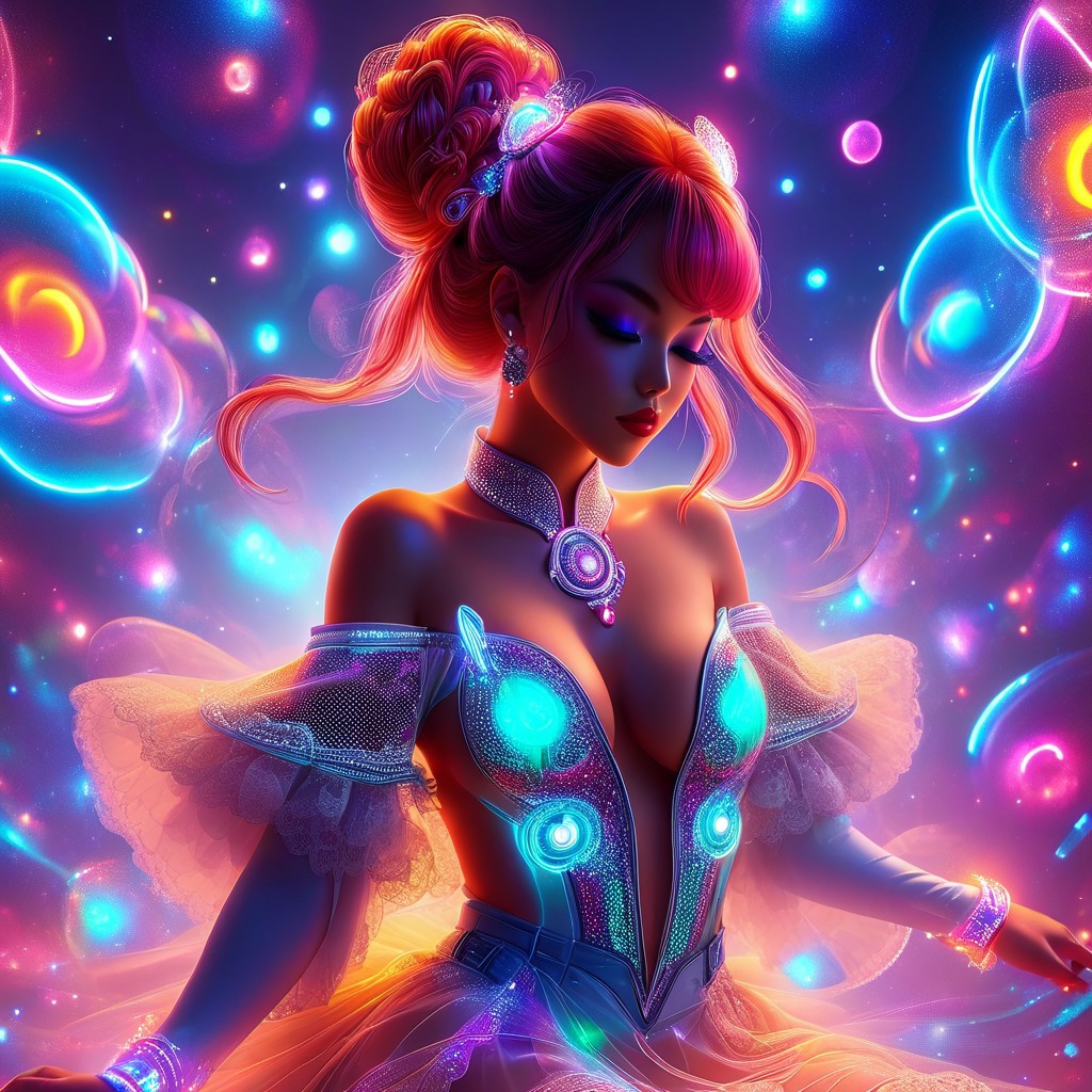 1female, Voluptuous, curvaceous, large perky breast, Puffy covered nipples, hair pinned up in space buns, intricately detailed eyes, expressive delicate lips, E-girl, Psychonaut, Raver-girl, (translucent, transparent, sheer, plunging neckline crop top, micro mini skirt with lace trim), converse shoes, lace thigh highs BREAK dancing in a crowded nightclub, dynamic pose, Intricately detailed EDM dance night club background, overhead LED special effects lighting, vibrant colors, fog machine BREAK perfect anatomy, perfect hands:2, hands sweeping through her hair, perfect fingers:2, perfect lighting, detailxl:.5, smooth shiny textures, vibrant colors BREAK ,Masterpiece:1.3, best quality:1.3, absurdres:1.3, highres, ultra-detailed:1.3, 8k, uhd, ray tracing render, sharp focus, wide angle cinematic shot, high contrast lighting, dynamic lighting, full body shot