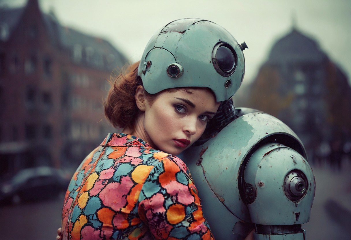 CyberRealistic_Negative, Create a surreal photo of a gorgeous fifties retro woman in a colorful bold pattern dress hugging a big robot, it’s a gloomy day, day in amsterdam, dark pastel colors, 35mm vintage kodak photography, easynegative, detailxl, CyberRealistic_Negative, perfecteyes, perfect eyes, skin blemish, detailed skin, FRESHIDEAS Illustration 62#, dark, chiaroscuro, low-key