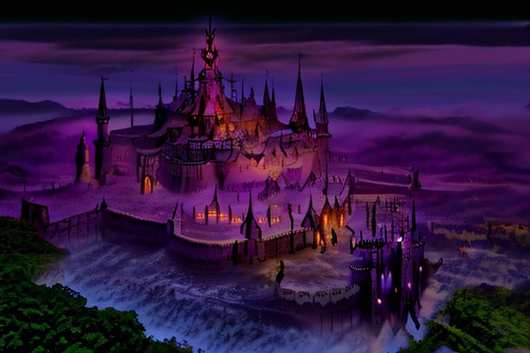 A huge dark castle with purple flames in the midnight