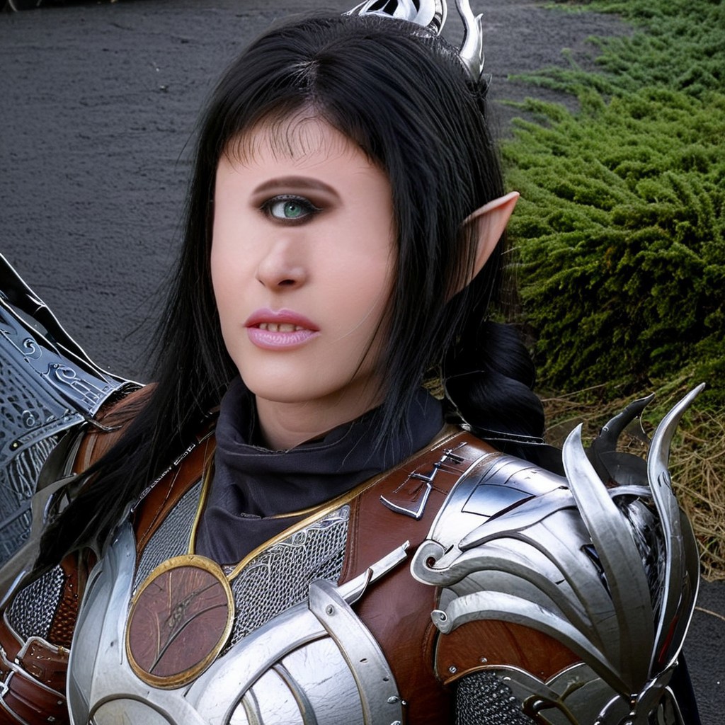 A high definition photo of Shadowheart a elf girl, wearing armor, swaying a warhammer, in combat, close-up portrait, high quality, realistic, cinematic <lora:shadowheart_xl_2-000090:1>, cyclopsgirl, thinmonobrow, (black hair):1.8