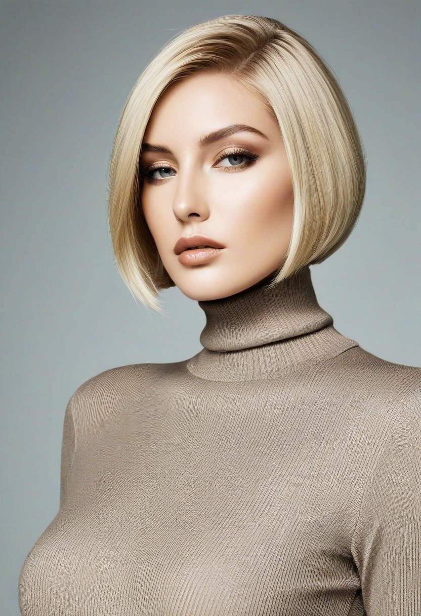 seductive beauty, inverted bob haircut, busty, curvy, turtleneck, straight blonde hair, german, beautiful face, looking at viewer, erotic photoshoot, three quarter view, photography by mario testino