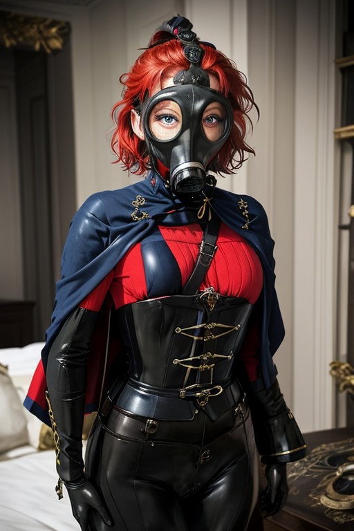 Felecia Manning (fictional character), a cute young woman, short bright red hair, blue eyes, model 4 gasmask, looking_at_viewer, hungarian hussar, 19th century, capelet,attila jacket,military uniform, model 4 gasmask.
