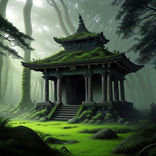 A beautifully detailed 2D scene of an ancient stone temple hidden deep within a misty forest. The temple is covered in moss and vines, with rays of light piercing through the dense canopy above. The trees are tall and dark, creating a serene and mysterious atmosphere. Vibrant green plants surround the temple, adding to the peaceful yet forgotten vibe