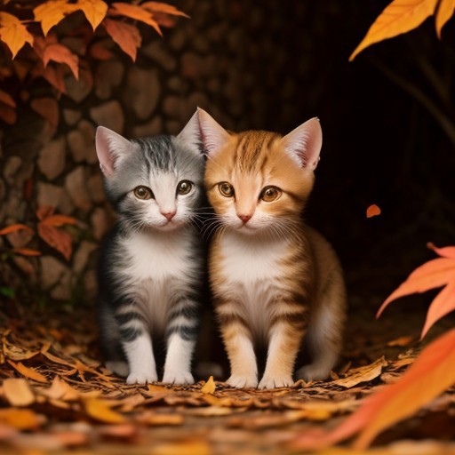Two small kittens, one orange and one gray, are peeking out from under a pile of fallen autumn leaves. Their curious eyes shine brightly as they playfully paw at each other. The ground is covered in vibrant red, orange, and yellow leaves, and the crisp air of fall is visible in the background.