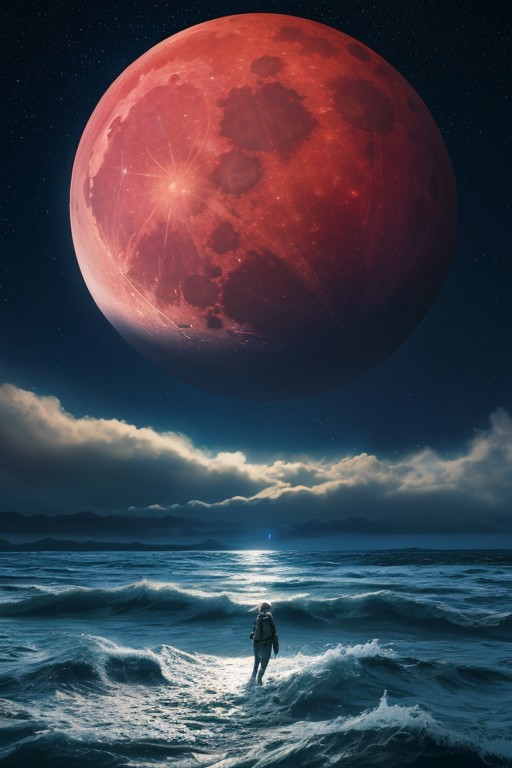 masterpiece, best quality, 4k, rising giant moon on alien world and giant tide on sea, cinematic colors,