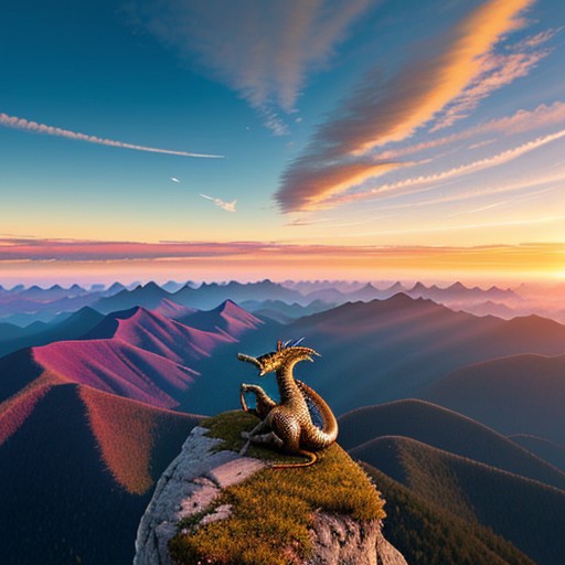 A mighty dragon perched on a rugged mountain peak, with the first rays of the sun casting a golden glow on its shimmering scales. The dragon’s wings are partially spread, and it gazes out over the vast landscape below. The sky is filled with a mix of pinks, oranges, and blues, with distant clouds reflecting the dawn light. The scene feels majestic, powerful, and ancient