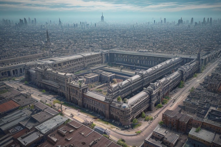 (Aerial panoramic view)++, dream landscape city, mysterious, colossal in extent, (spires reaching high into the sky)++, grim gray walls, stretching far beyond the horizon, ominous roofs, rich friezes, alluring sculptures, city’s pier near a huge carven gate, (streets white with unburied bones)++, colossal train station, no humans, (high detail)++, photorealistic, 8k