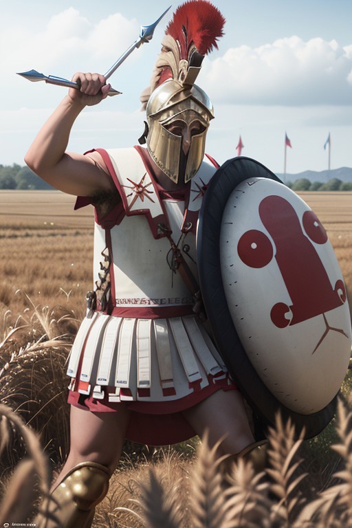 epic illustration of a man wearing linothorax armor and helmet and greaves, red tunic, holding shield, holding spear, in a battle, gritty, traditional media, smoke, wheat field <lora:linothorax_V2-10:0.8> <lora:detail_slider_v4:0.5>