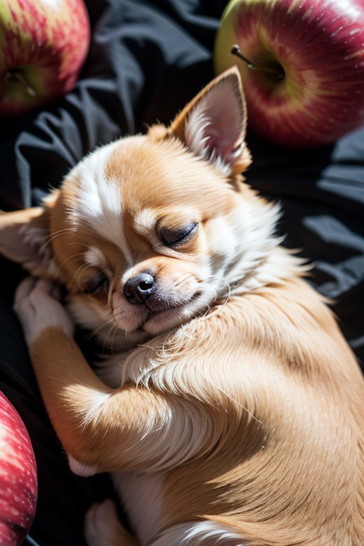 fluffy Chihuahua sleeping on its stomach, on many apples, closed eyes, closeup shot, (masterpiece, best quality:1.4), ultra-high res, 4k, 8k, insanely detailed, insanely beautiful, perfect finish,
