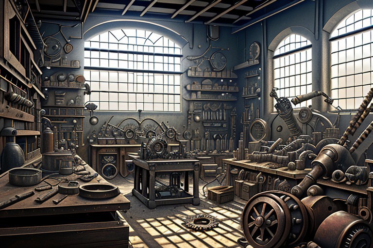 A cluttered steampunk inventor's workshop filled with gears, cogs, and copper pipes. A large mechanical clock ticks on the wall, while the inventor, dressed in a leather apron and goggles, works on a half-finished automaton. Sunlight streams through a window, highlighting the intricate machinery and the smell of oil and metal in the air