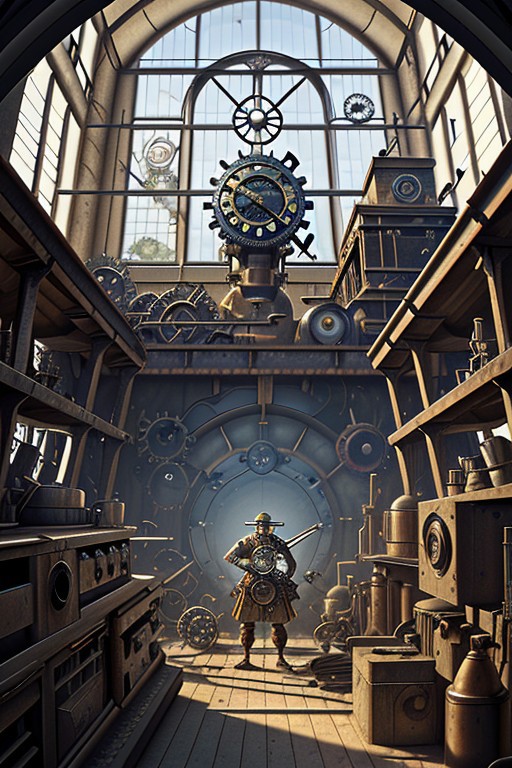 A cluttered steampunk inventor's workshop filled with gears, cogs, and copper pipes. A large mechanical clock ticks on the wall, while the inventor, dressed in a leather apron and goggles, works on a half-finished automaton. Sunlight streams through a window, highlighting the intricate machinery and the smell of oil and metal in the air