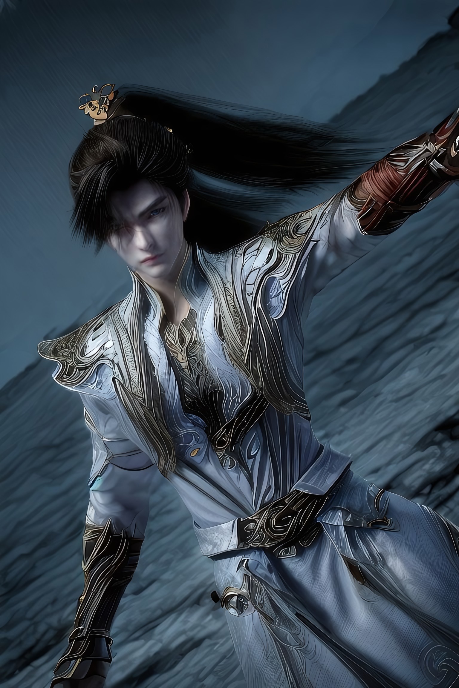 shihao, 1boy, solo, blue eyes, wallpaper, full shot, realistic, natural lighting, photorealistic, masterpiece, beautiful, (masterpiece, best quality, highres:1.2), (photorealistic:1.2), (intricate and beautiful:1.2), (detailed light:1.2), (soft lighting, side lighting, reflected light), (colorful), fashion photography, light passing through hair, (official art), (perfect skin), (sharp), black hair,long hair, ponytail,(looking at viewer:1.2), hair ornament, white dress, outdoors, autumn, blue lake, night, night time, full moon, beautiful face,AGGA_ST043, alluring face