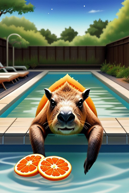 Dream shaper style for a very elegant capybara swimming into a gin pool with Orange slices into milky way very detailed