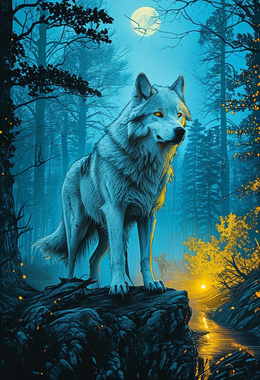 Ink illustration, blue tones, aged black red paper, inkpunk, moonlight, moonlit, forest, (gigantic white wolf, glowing yellow eyes), menacing, ferocious, OverallDetail, extremely detailed, UHD, (long exposure, extremely beautiful:1.4)