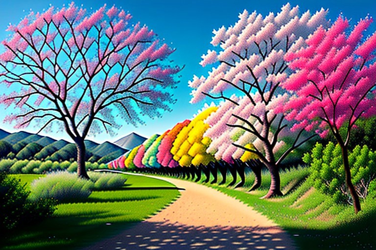 Un parque lleno de flores silvestres de colores brillantes y árboles altos que proporcionan sombra. Hay un sendero de tierra que serpentea entre los árboles, y al fondo se ve un lago tranquilo. Las personas caminan por el sendero disfrutando del aire fresco, mientras aves vuelan entre los árboles