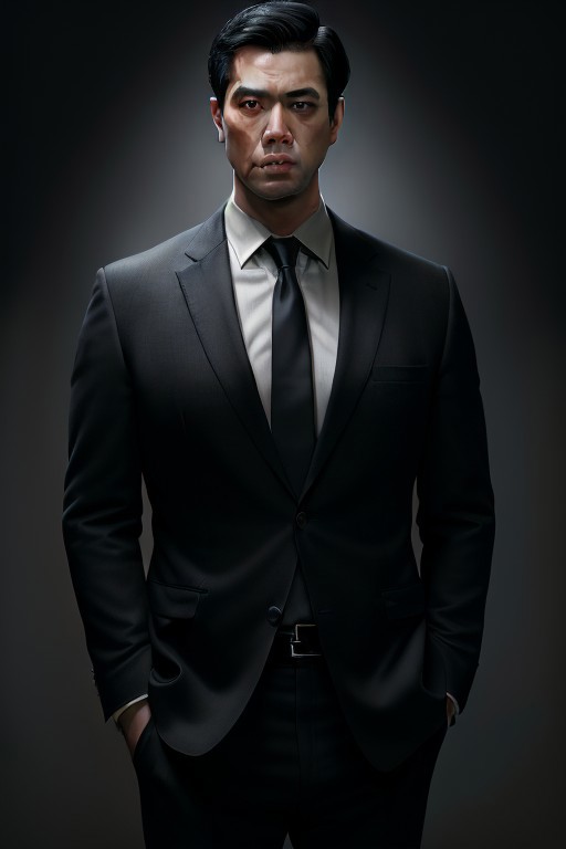 best quality,masterpiece,(realistic:1.2)quality,realistic,masterpiece,Highly detailed,1boy,office man,adult,asian,black hair,suit,standing,hand in pocket,grey_background,moody lighting,full_shot,frontlight,highres,absurdres,incredibly_absurdres,huge_filesize,