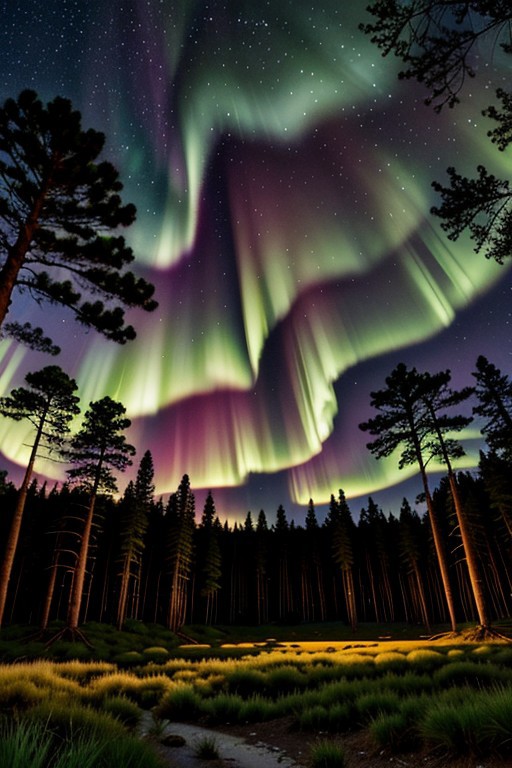 Dark forest, pine forest, night time, night, stars, dusk, pine trees, small cycad trees, bush, ferns, colorful auroras from the skies, forest floor