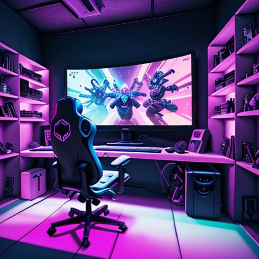 A modern gaming room illuminated by RGB lights glows in vibrant shades of blue, purple, and pink. In the center, a high-end gaming desk holds a sleek, curved monitor with vivid game graphics displayed. A mechanical keyboard with colorful backlighting sits beside a gaming mouse with customizable LED effects. Surrounding the desk are shelves filled with game collectibles, action figures, and trophies. On the walls, neon signs and posters of iconic video games add a bold, energetic vibe. A comfortable gaming chair with a futuristic design faces the setup, ready for the next gaming session. The room has a clean, tech-savvy atmosphere with subtle ambient lighting creating an immersive environment.