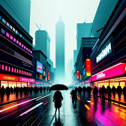 A busy city street at night, drenched in rain. Neon signs reflect off the wet pavement, casting vibrant colors on the passing cars and pedestrians. People with umbrellas hurry through the street, their faces barely visible under the dim light, while a lone figure stands in the middle, gazing up at the towering skyscrapers