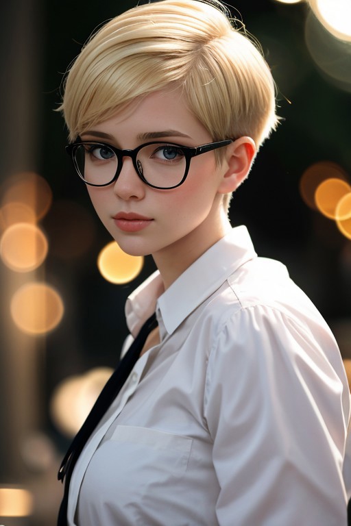dark shot, white caucasian woman, photo of cute 24 years old woman with short blonde pixie haircut, singer, cinematic shot, photorealistic, cute face, glasses, looking at viewer, sad look on her face, light effects, black eyes, wearing black shirt, sensual, ethereal, dreamlike, surreal, glow, bloom, sparkle, bokeh background