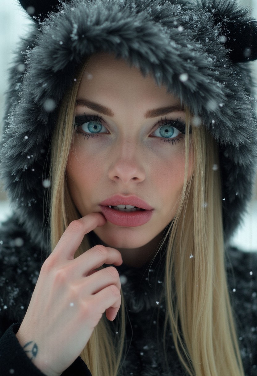 close-up of a stunning gothic style young woman with long straight blonde hair, detailed ice blue doe eyes, full lips, tinted lip gloss, flushed, perfect skin, large fangs, fur coat with hood and animal ears on hood, realistic and delicate facial features, light snow fall with large snow flakes, photorealistic rendering, One hand resting on the chin, shoulders slightly hunched, head tilted slightly downwards. detailed photorealism style, detailed skin pore style, perfection style,