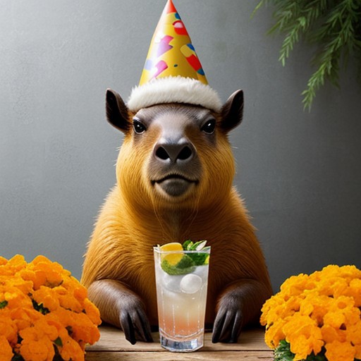 a fancy capybara with party hat and a Tagetes erecta gin tonic