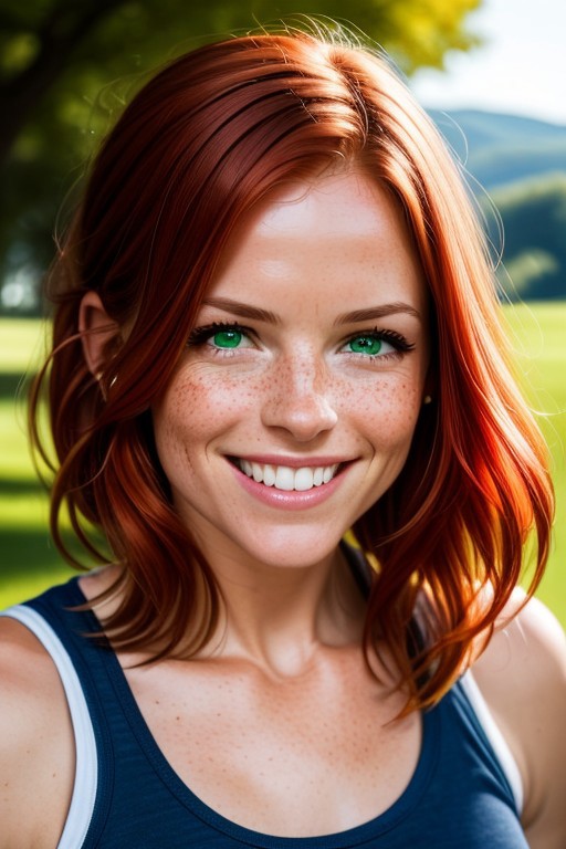 close-up portrait of a beautiful woman with straight red hair, green eyes, wearing an white tank top, outdoors, airstrip, smiling. Claire, freckles, ginger