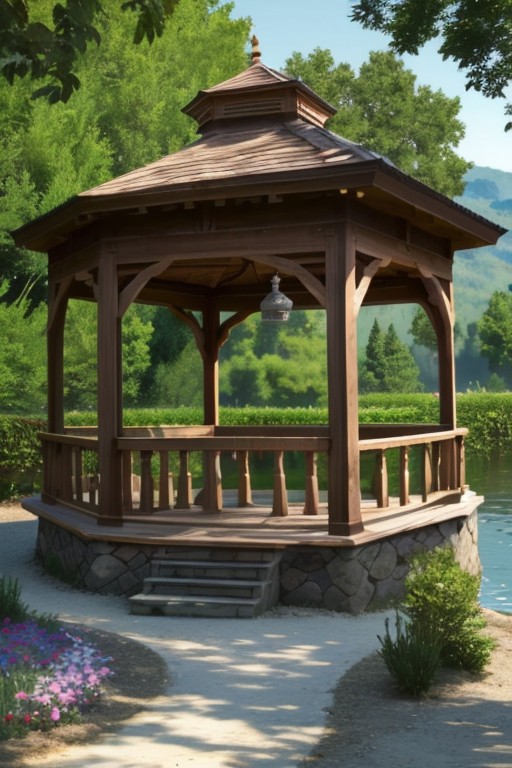 Masterpiece, best quality, UHD, 16k, high res, high detailed, wooden gazebo in the garden, entwined with vines and flowers, view from the gazebo to the river bank, epic, soft colors