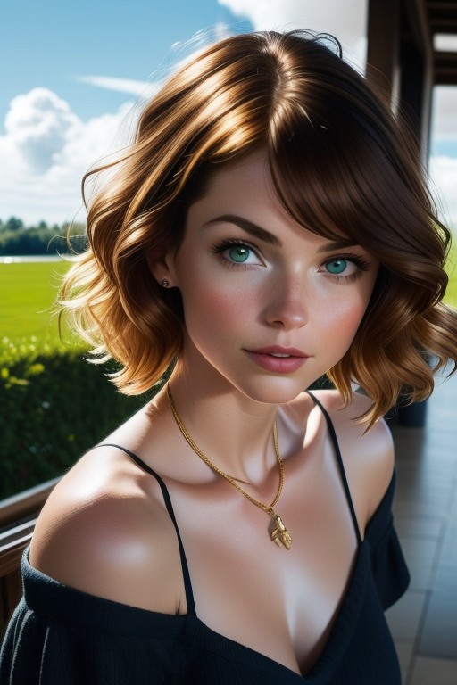 The image is a portrait of a young woman with long, wavy dark brown hair. She is looking directly at the camera with a serious expression on her face. Her hair is styled in loose curls that frame her face and falls over her shoulders. She has a slight smile on her lips and is wearing a navy blue off-the-shoulder top. The background is blurred, but it appears to be a cloudy sky with a hint of greenery. The overall mood of the image is calm and serene. swansen, pale_redhead, 1dk
