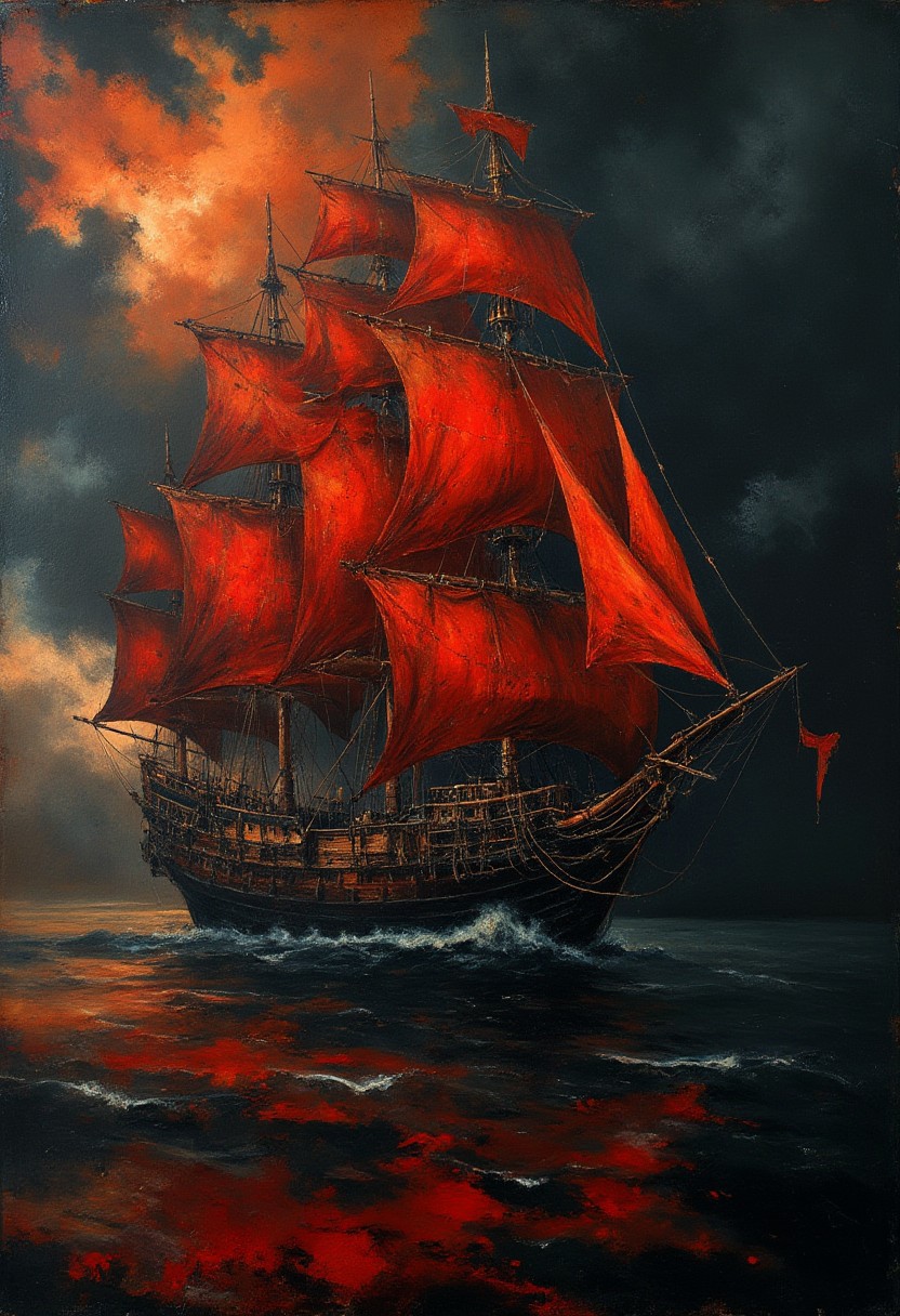 A 17th century Spanish Red Galleon cruises trough the void of a ink, the Galleon is cover in bright black decors, in sails of the ship are famous Goya’s paintings. The mood of the scene has an atmosphere of danger. The overall of the piece is a fever dream of a painter going insane. The piece looks 17th paint that evokes madness, contrast and unworldliness.