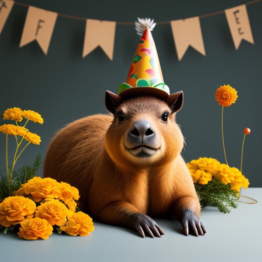 a fancy capybara with party hat and a Tagetes erecta gin tonic